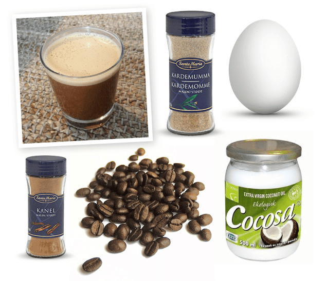 Gör så här: Stavmixa 1 ägg, 1-2 msk kokosolja/kokosfett, 1 krm kardemumma och kanel. (förslagsvis i ett litermått) Häll på en kopp färdigbryggt kaffe och mixa i ytterligare 10-20 sek.