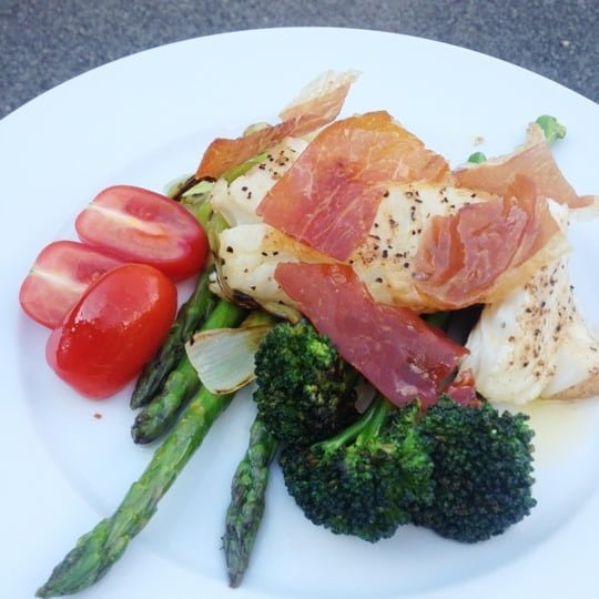 Torskfilé med parmachips, broccoli, sparris, vårlök och skirat smör.