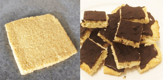 - Bred ut en kvadrat på ca 15×15 cm. Grädda i 10-15 minuter. Låt svalna.