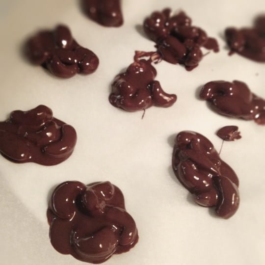 Smält mör choklad i vattenbad eller på låg värme direkt i kastrullen. Sikta i pepparkakskryddorna. Blanda i nötterna och gör lagom stota högar på bakplåstpapper. Låt stå kallt.