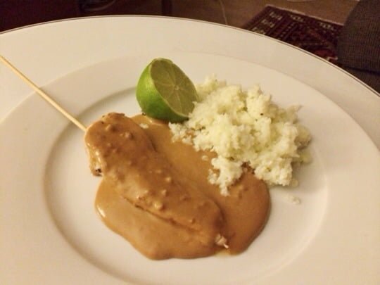 Kycklingspett med jordnötssås och blomkålsris med kokos (4 port)