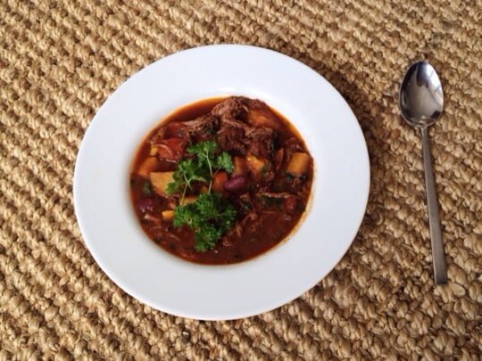 Använd några skedar spad som grund. Späd med vatten och en skvätt rödvin och i med tärnad kålrot och rotselleri. Låt puttra i 10-15 min (tills rotfrukterna är nästan klara). I med delade tomater och hackad persilja och köttet. Låt puttra tills allt är varmt.