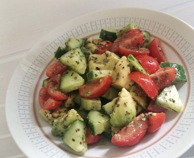 Skär grönsakerna och ringla över olivolja och pressad ekologisk citron. Krydda med mynta, salt och peppar. Låt stå i kylen tills resten av maten är klar.