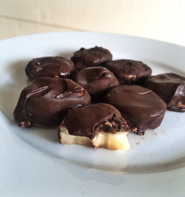 Gör såhär: Smält chokladen i vattenbad, ca 50-75 gram choklad per banan. Skiva bananen och doppa i chokladen. Låt stå i frysen på bakplåtspapper några timmar.