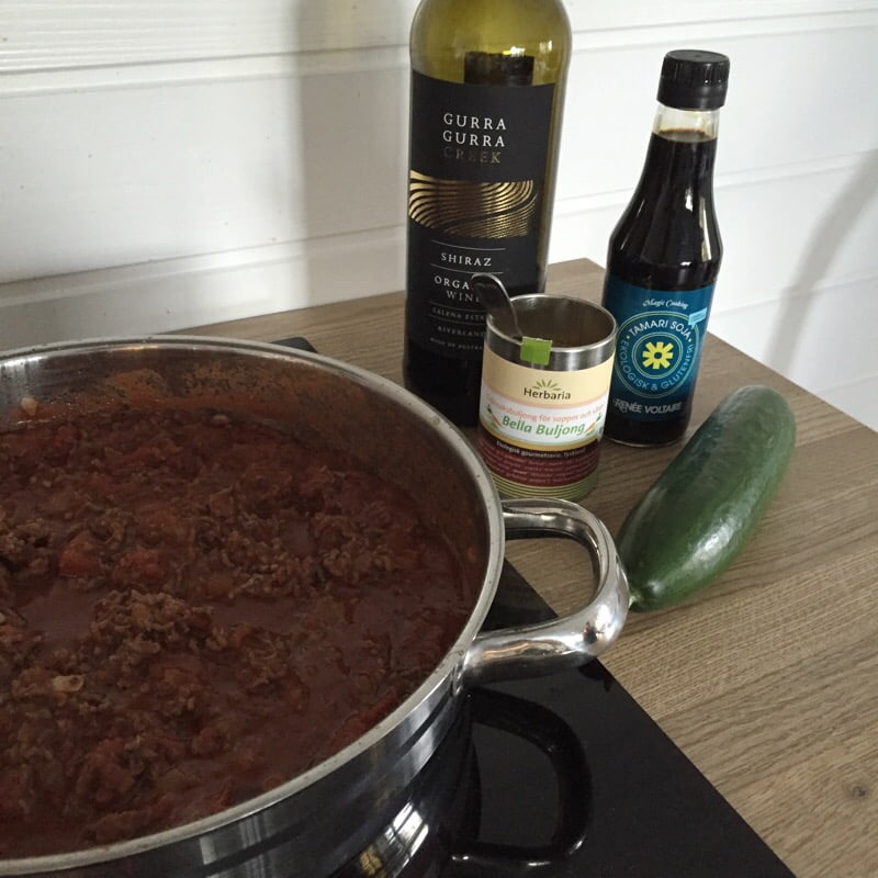 Fräs vitlök och lök i olja eller smör. I med nötfärsen och bryn den. Häll i tomatpuré, krossade tomater, vin och buljong. Låt puttra och smaksätt med tamari, salt och peppar.